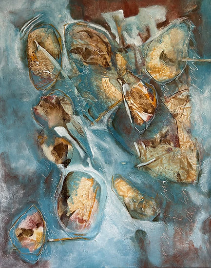 Un viaje visual que traza, como un hilo invisible, las memorias y el tiempo sobre el lienzo. Cada obra entreteje fragmentos de recuerdos, imágenes y emociones, dibujando una cartografía íntima que a veces se desvanece y otras permanece nítida, como vestigio de lo vivido.